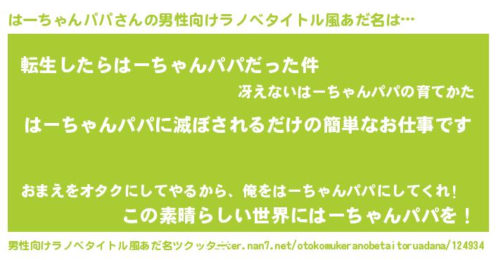 | 胡散臭い通販商品みたいなあだ名 | 『あなたにだけ特別に提供する世界で10本だけ現存している希少なブランデー…その名も「はーちゃんパパ」』 |