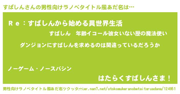 | 女子向けラノベタイトル風あだ名 | 『すばしんの卵を拾いまして』 |