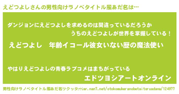 | 女子向けラノベタイトル風あだ名 | 『えどつよしの玉の輿計画!』 |