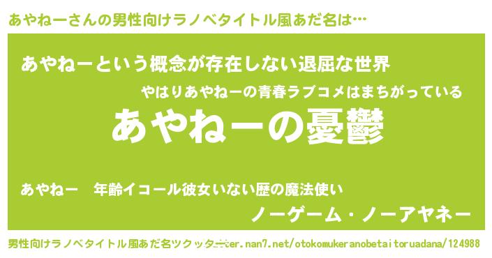 | 女子向けラノベタイトル風あだ名 | 『(仮)あやねーのやんごとなき事情』 |