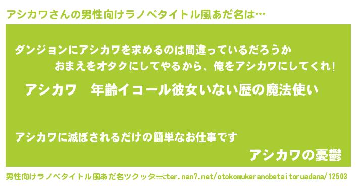 | 女子向けラノベタイトル風あだ名 | 『アシカワの玉の輿計画!』 |