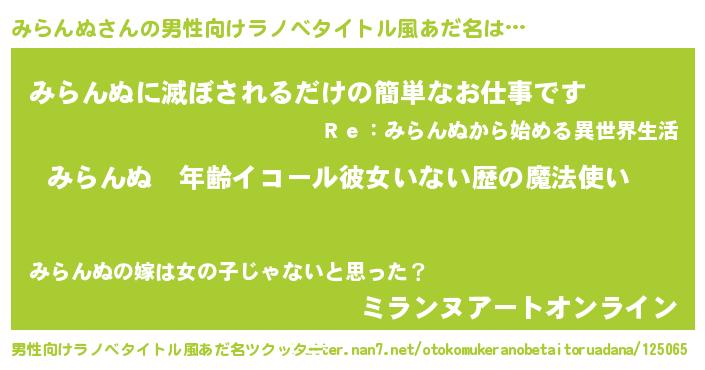 | 女子向けラノベタイトル風あだ名 | 『みらんぬの玉の輿計画!』 |