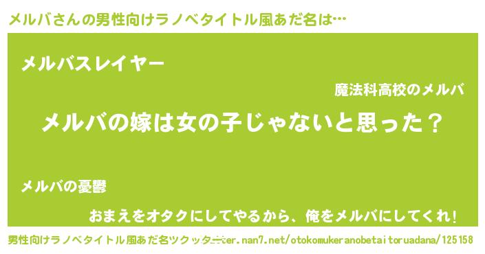 女子向けラノベタイトル風あだ名 | 『メルバの卵を拾いまして』 |