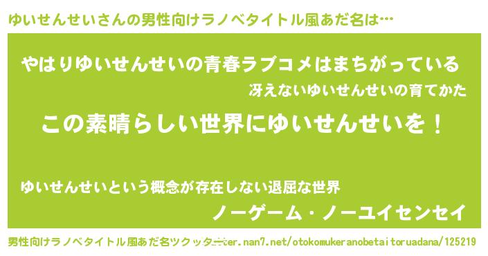 | 女子向けラノベタイトル風あだ名 | 『悪役ゆいせんせいに転生したようですが、知った事ではありません』 |