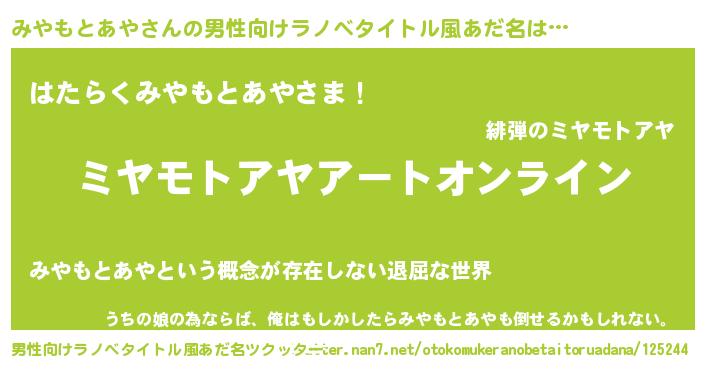| 胡散臭い通販商品みたいなあだ名 | 『億万長者になれるブレスレット…その名も「みやもとあや」』 |