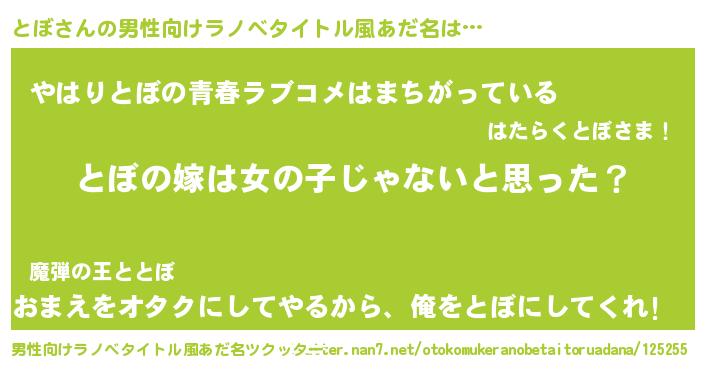 | 女子向けラノベタイトル風あだ名 | 『とぼ様がみてる』『とぼの雑貨屋さん』 |