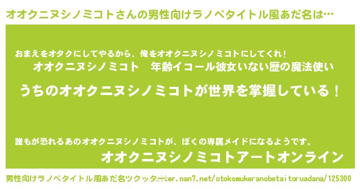 | 女子向けラノベタイトル風あだ名 | 『男装オオクニヌシノミコトの憂鬱な任務』 |