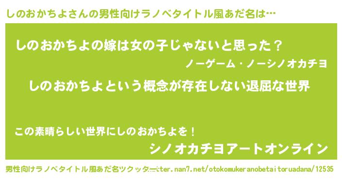 | 女子向けラノベタイトル風あだ名 | 『異世界で失敗しない100のしのおかちよ』 |