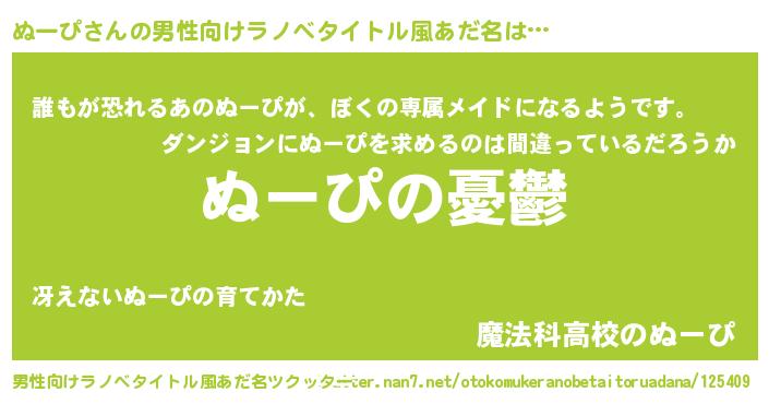 | 女子向けラノベタイトル風あだ名 | 『(仮)ぬーぴのやんごとなき事情』 |