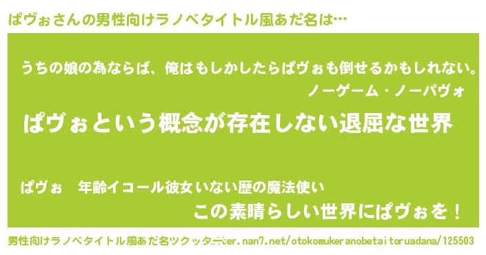 | 女子向けラノベタイトル風あだ名 | 『異世界で失敗しない100のぱヴぉ』 |
