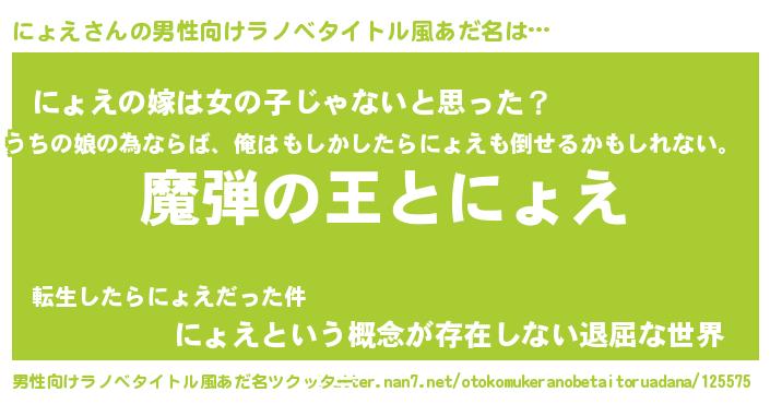 | 女子向けラノベタイトル風あだ名 | 『にょえが死なない童話 林檎のにょえの診療簿』 |