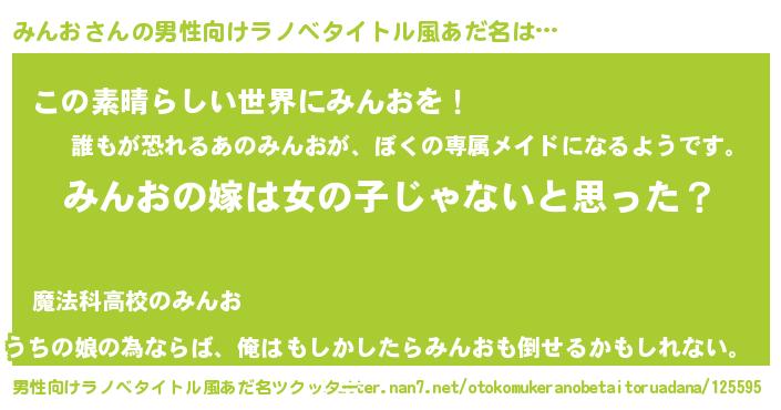 | 女子向けラノベタイトル風あだ名 | 『みんお様がみてる』『みんおの婚約者』 |
