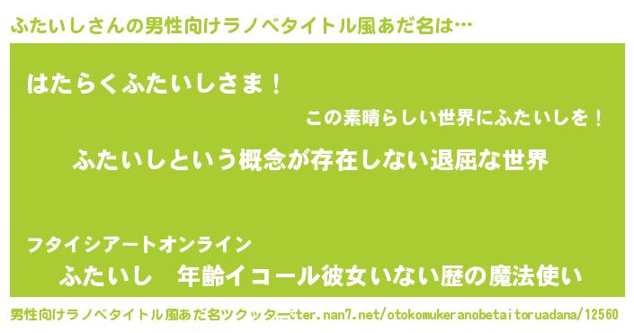 | 女子向けラノベタイトル風あだ名 | 『異世界で失敗しない100のふたいし』 |