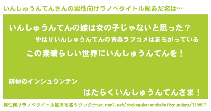 | 胡散臭い通販商品みたいなあだ名 | 『あなたにだけ特別に提供する100年もののヴィンテージワイン…その名も「いんしゅうんてん」』 |