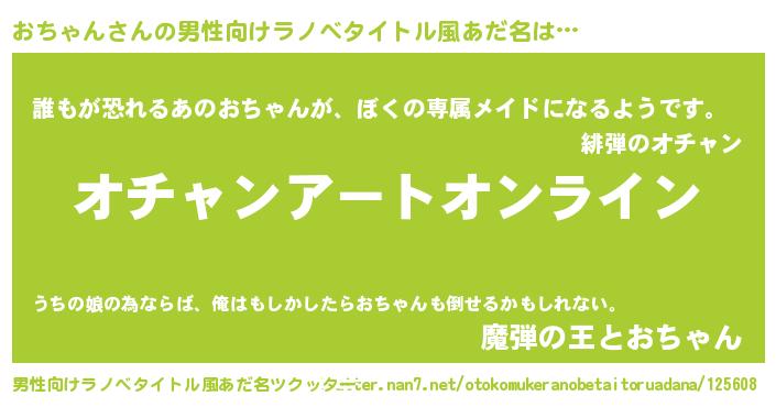 | 女子向けラノベタイトル風あだ名 | 『誰かこのおちゃんを説明してください! ~契約から始まるウェディング~』 |