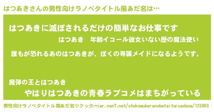 | 女子向けラノベタイトル風あだ名 | 『異世界でカフェはつあきを開店しました。』 |