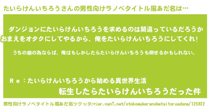 | 女子向けラノベタイトル風あだ名 | 『たいらけんいちろう伯爵の花嫁』 |