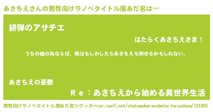 | 女子向けラノベタイトル風あだ名 | 『あさちえ伯爵の花嫁』『闇のあさちえ』 |