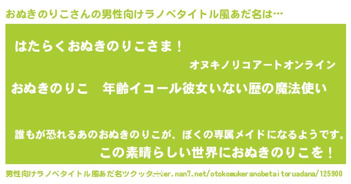 | 女子向けラノベタイトル風あだ名 | 『おぬきのりこの玉の輿計画!』 |