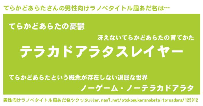 | 胡散臭い通販商品みたいなあだ名 | 『必ず成功するブレスレット…その名も「てらかどあらた」』 |