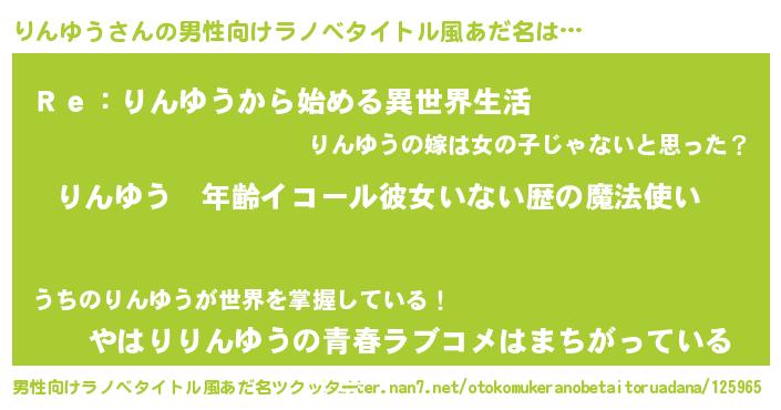 | 女子向けラノベタイトル風あだ名 | 『りんゆうの玉の輿計画!』 |