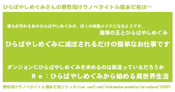 | ヘコむあだ名 | 『ひらばやしめぐみ(笑)』『ひらを』 |