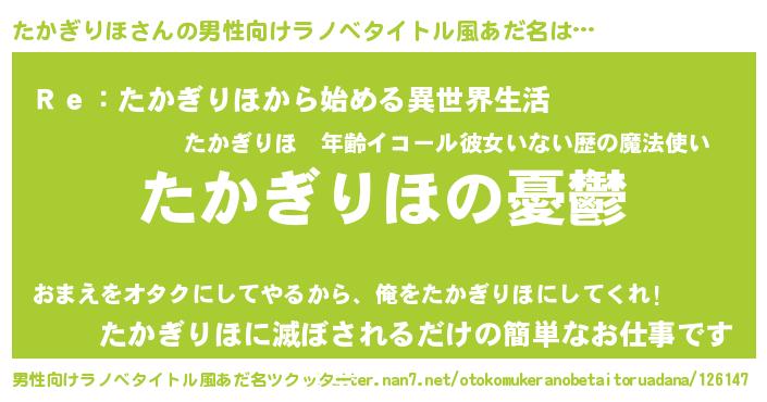 | 女子向けラノベタイトル風あだ名 | 『(仮)たかぎりほのやんごとなき事情』 |
