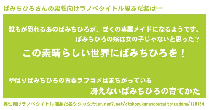 | 胡散臭い通販商品みたいなあだ名 | 『世界中を虜にした100年もののヴィンテージワイン…その名も「ばみちひろ」』 |