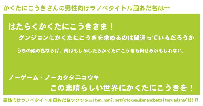 | 女子向けラノベタイトル風あだ名 | 『かくたにこうき伯爵の花嫁』 |