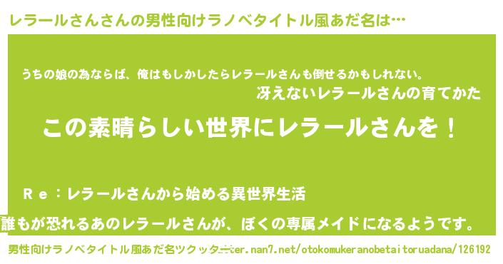 | 女子向けラノベタイトル風あだ名 | 『乙女ゲームの破滅フラグしかない悪役レラールさんに転生してしまった…』 |