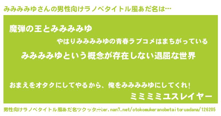 | 女子向けラノベタイトル風あだ名 | 『異世界で失敗しない100のみみみみゆ』 |
