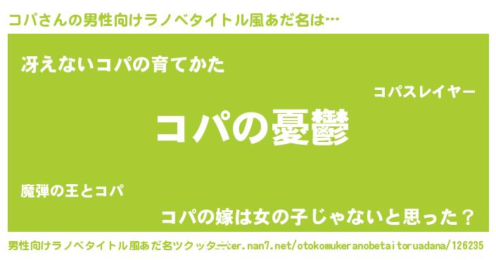 | 女子向けラノベタイトル風あだ名 | 『(仮)コパのやんごとなき事情』 |