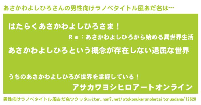 | 女子向けラノベタイトル風あだ名 | 『異世界で失敗しない100のあさかわよしひろ』 |