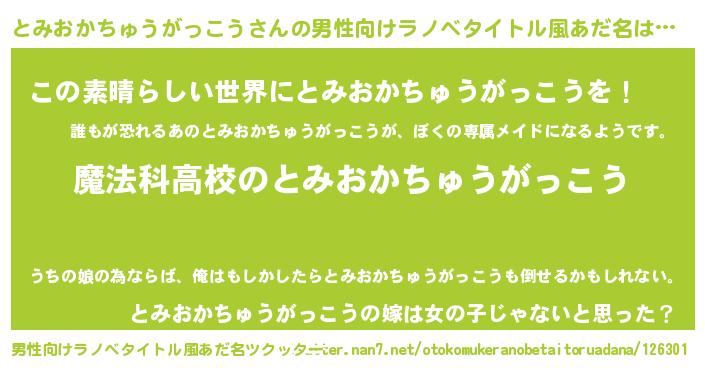 | 女子向けラノベタイトル風あだ名 | 『とみおかちゅうがっこうなんてお断りですっ。』 |