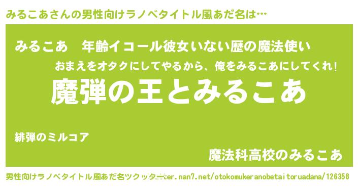 | 女子向けラノベタイトル風あだ名 | 『みるこあが死なない童話 林檎のみるこあの診療簿』 |