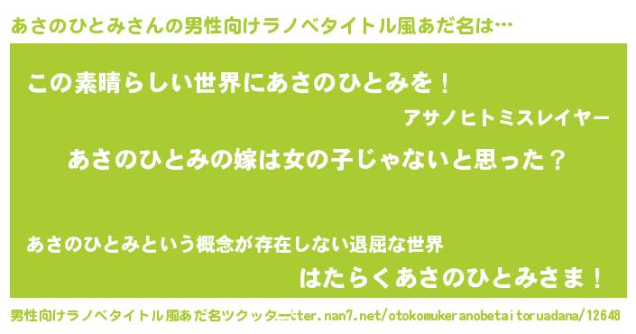 | 女子向けラノベタイトル風あだ名 | 『あさのひとみ様がみてる』 |