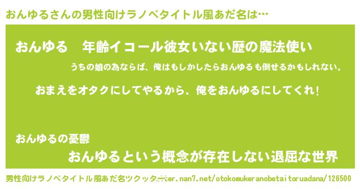 | 女子向けラノベタイトル風あだ名 | 『おんゆる夫妻のなれそめ』 |