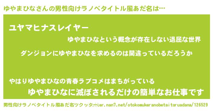 | 胡散臭い通販商品みたいなあだ名 | 『伝統あるサプリメント…その名も「ゆやまひな」』 |