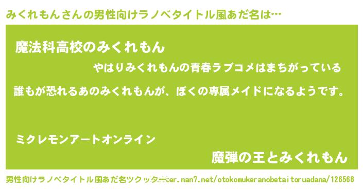 | 女子向けラノベタイトル風あだ名 | 『異世界でカフェみくれもんを開店しました。』 |