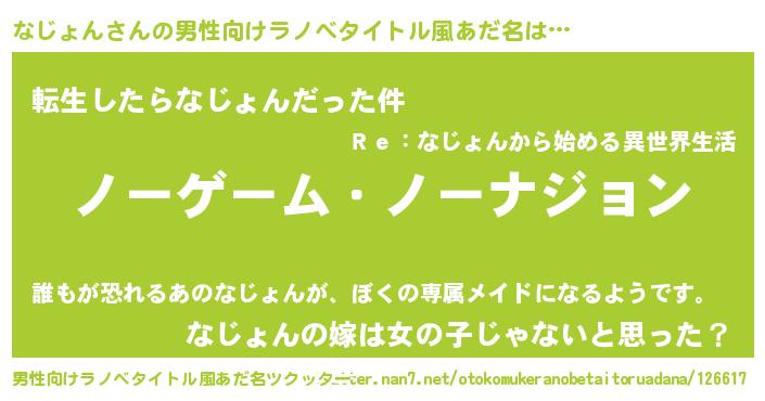 | 女子向けラノベタイトル風あだ名 | 『死神なじょんの再婚』 |