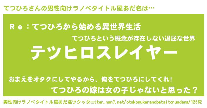 | 意味不明あだ名 | 『めかぶ科てつひろ属』『自称てつひろ』 |