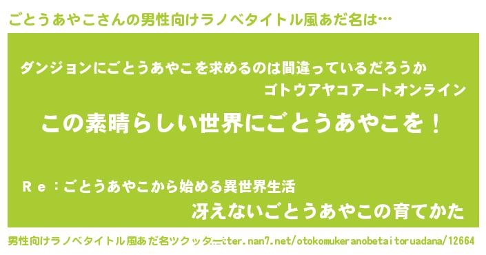 | 女子向けラノベタイトル風あだ名 | 『悪役ごとうあやこに転生したようですが、知った事ではありません』 |