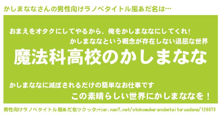 | 胡散臭い通販商品みたいなあだ名 | 『ガンによく効く高麗人参…その名も「かしまなな」』 |