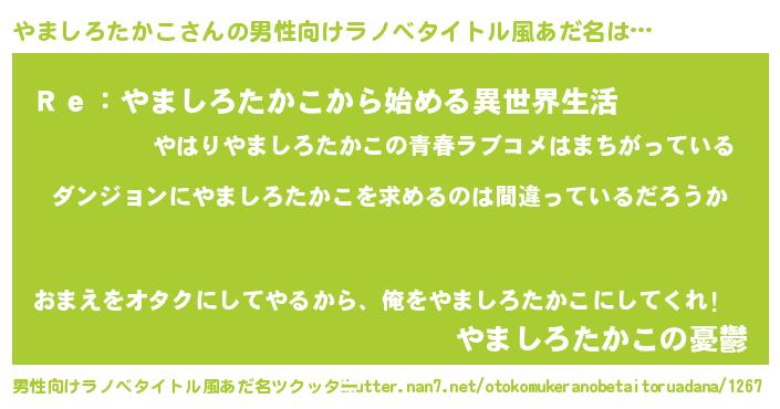 | 女子向けラノベタイトル風あだ名 | 『やましろたかこは平凡を望む』 |