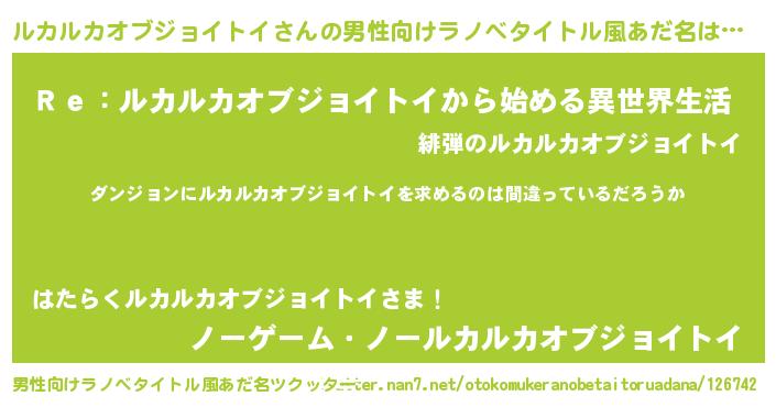 | 女子向けラノベタイトル風あだ名 | 『ルカルカオブジョイトイは平凡を望む』 |