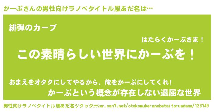 | 胡散臭い通販商品みたいなあだ名 | 『あなたにだけ特別に提供する限定10本のレアな日本酒…その名も「かーぶ」』 |
