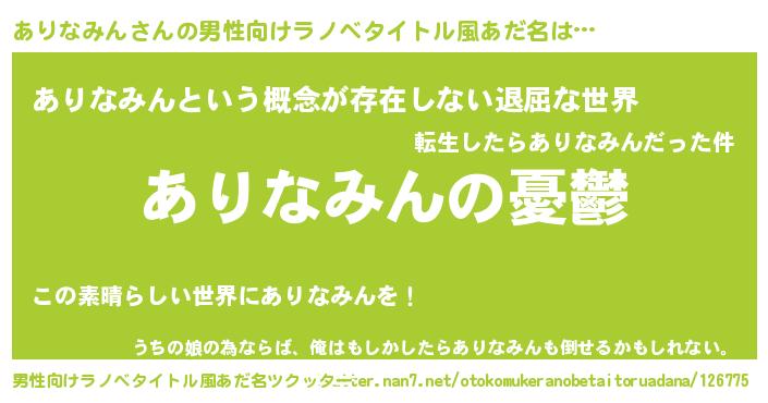| 女子向けラノベタイトル風あだ名 | 『(仮)ありなみんのやんごとなき事情』 |