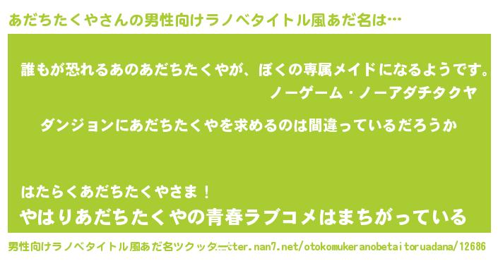 | 女子向けラノベタイトル風あだ名 | 『あだちたくやの卵を拾いまして』 |