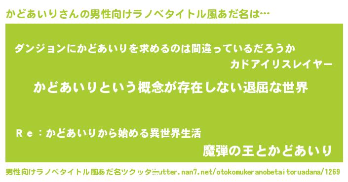 | 女子向けラノベタイトル風あだ名 | 『異世界で失敗しない100のかどあいり』 |