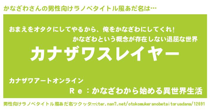 女子向けラノベタイトル風あだ名 | 『婚約破棄系悪役かなざわに転生したので、保身に走りました。』 |
